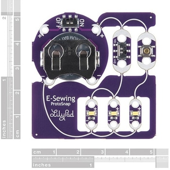 The E-Sewing ProtoSnap includes three white LilyPad LEDs:two connected to a LilyPad Slide Switch and one connected to a LilyPad Button Board. A LilyPad Coin Cell Battery Holder with the included CR2032 coin cell battery provides all the power you need for the circuit. All you need to do is design how you want your project to be laid out, and then snap everything apart!