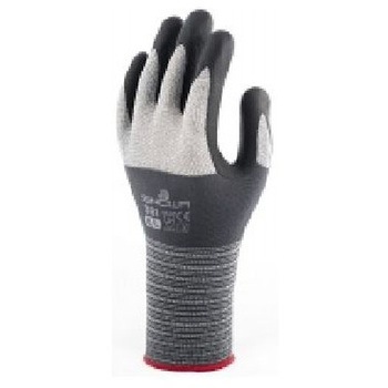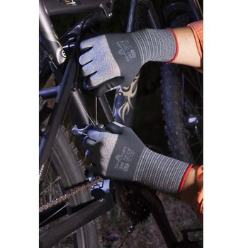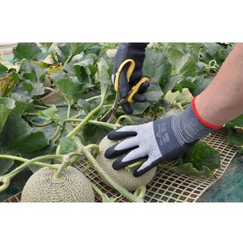 マイクロファイバー糸を採用し、編み目を密にすることで肌への密着性が高まり、手袋内面のスベリ止め効果を生み出します。手袋の中で手がスベリにくく、快適に作業ができます。指先をダブルコートで強化しています。耐油性に優れています。裾部分は、ほつれを防ぐオーバーロック加工を施しています。繊維部分は編み目が細かく縫い合わせのない、独自の13ゲージ・シームレス編み手袋です。