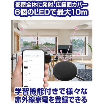外出先から家電のリモコン操作。かさばるリモコンをスマホに集約、エアコンやテレビの赤外線操作の機器に対応。アプリを使って外出先から遠隔操作でオン/オフ、スマートカメラと連動してエアコンの消し忘れを防止。アプリ内設定でタイマー設定できる、起床時にエアコン/テレビ/照明を同時にオン/オフ。ミニサイズでどこでも設置、電源に繋いでWi-Fi環境に簡単接続。Alexa、GoogleHomeの音声操作に対応。リモコン学習機能付き。