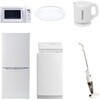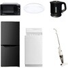 用途寮や事務所、休憩室などに。会社 オフィス 事務室 休憩室 仮眠室 ラウンジ 給湯室 寮 合宿 施設 宿泊 民泊 ホテル 旅館 宿舎 新生活 引越し 単身赴任 大学入学 スターターセット 家電セット 冷蔵庫 洗濯機仕様【シーリング】幅50×奥行50×高さ9.5cm●全光束:3500lm●30分、60分OFFタイマー付き【冷蔵庫】幅47.4×奥行49.5×高さ113cm●容量:106L(冷蔵室73L/冷凍室33L)●年間消費電力量:268kWh/年(50Hz/60Hz)【掃除機】スティック時サイズ:幅24×奥行13×高さ111cm●ハンディ時サイズ:幅10×奥行10.5×高さ48cm●スティック&ハンディの2WAY●吸込仕事率:40W【洗濯機】幅56×奥行54.5×高さ98cm●容量:6.0kg(洗濯時)、1.5kg(風乾燥時)●8つのコース搭載(標準・毛布・おいそぎ・ドライ・ソフト・つけおき・部屋干し・槽洗浄)【電子レンジ】幅44×奥行32.5×高さ25.5cm●容量17L、ターンテーブル●高周波出力:50Hz(500W、200W相当)、60Hz(650W、500W、200W相当)【電気ケトル】幅21.5×奥行15×高さ18.5cm●容量:1.0L●空焚き防止機能搭載間口(mm)474保証期間1年定格内容積(L)106内容量1セット