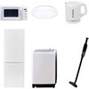 用途寮や事務所、休憩室などに。会社 オフィス 事務室 休憩室 仮眠室 ラウンジ 給湯室 寮 合宿 施設 宿泊 民泊 ホテル 旅館 宿舎 新生活 引越し 単身赴任 大学入学 スターターセット 家電セット 冷蔵庫 洗濯機仕様【シーリング】幅50×奥行50×高さ9.5cm●全光束:3500lm●30分、60分OFFタイマー付き【冷蔵庫】幅50×奥行56×高さ142.2cm●容量:173L(冷蔵室121L/冷凍室52L)●年間消費電力量:250kWh/年(50Hz/60Hz)【掃除機】スティック時サイズ:幅22.6×奥行10.3×高さ100cm●ハンディ時サイズ:幅7.5×奥行7.5×高さ46cm●わずか870gの軽量クリーナー●吸込仕事率:(パワフル)46W、(標準)23W、(弱)15W【洗濯機】幅60×奥行59.5×高さ94.5cm●容量:8.0kg(洗濯時)、1.5kg(風乾燥時)●8つのコース搭載(標準・毛布・おいそぎ・ドライ・ソフト・つけおき・部屋干し・槽洗浄)【電子レンジ】幅44×奥行32.5×高さ25.5cm●容量17L、ターンテーブル●高周波出力:50Hz(500W、200W相当)、60Hz(650W、500W、200W相当)【電気ケトル】幅21.5×奥行15×高さ18.5cm●容量:1.0L●空焚き防止機能搭載間口(mm)500保証期間1年定格内容積(L)173内容量1セット
