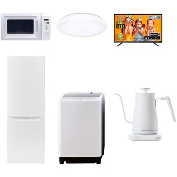 用途寮や事務所、休憩室などに。会社 オフィス 事務室 休憩室 仮眠室 ラウンジ 給湯室 寮 合宿 施設 宿泊 民泊 ホテル 旅館 宿舎 新生活 引越し 単身赴任 大学入学 スターターセット 家電セット 冷蔵庫 洗濯機仕様【TV】本体寸法:幅96.7×奥行8.9×高さ56.6cm●スタンド取付時サイズ:幅96.7×奥行22.2×高さ62.6cm●サイズ:43V型●2K対応ハイビジョン液晶テレビ【シーリング】幅50×奥行50×高さ9.5cm●全光束:3500lm●30分、60分OFFタイマー付き【冷蔵庫】幅50×奥行56×高さ142.2cm●容量:173L(冷蔵室121L/冷凍室52L)●年間消費電力量:250kWh/年(50Hz/60Hz)【洗濯機】幅60×奥行59.5×高さ94.5cm●容量:8.0kg(洗濯時)、1.5kg(風乾燥時)●8つのコース搭載(標準・毛布・おいそぎ・ドライ・ソフト・つけおき・部屋干し・槽洗浄)【電子レンジ】幅44×奥行32.5×高さ25.5cm●容量17L、ターンテーブル●高周波出力:50Hz(500W、200W相当)、60Hz(650W、500W、200W相当)【電気ケトル】幅28.5×奥行18×高さ22.5cm●容量:800ml●温度設定範囲:60-100度の間で1度単位で温度調整可能間口(mm)500保証期間1年定格内容積(L)173内容量1セット