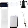 用途寮や事務所、休憩室などに。会社 オフィス 事務室 休憩室 仮眠室 ラウンジ 給湯室 寮 合宿 施設 宿泊 民泊 ホテル 旅館 宿舎 新生活 引越し 単身赴任 大学入学 スターターセット 家電セット 冷蔵庫 洗濯機仕様【オーブンレンジ】幅48.5×奥行37.6×高さ30.2cm●容量18L、フラットテーブル●高周波出力:650W(60Hzのみ)/500W/200W相当【シーリング】幅50×奥行50×高さ9.5cm●全光束:3500lm●30分、60分OFFタイマー付き【冷蔵庫】幅50×奥行56×高さ142.2cm●容量:173L(冷蔵室121L/冷凍室52L)●年間消費電力量:250kWh/年(50Hz/60Hz)【掃除機】スティック時サイズ:幅24×奥行13×高さ111cm●ハンディ時サイズ:幅10×奥行10.5×高さ48cm●スティック&ハンディの2WAY●吸込仕事率:40W【洗濯機】幅60×奥行59.5×高さ94.5cm●容量:8.0kg(洗濯時)、1.5kg(風乾燥時)●8つのコース搭載(標準・毛布・おいそぎ・ドライ・ソフト・つけおき・部屋干し・槽洗浄)【電気ケトル】幅28.5×奥行18×高さ22.5cm●容量:800ml●温度設定範囲:60-100度の間で1度単位で温度調整可能間口(mm)500保証期間1年定格内容積(L)173内容量1セット