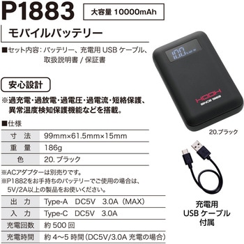 ※使用可能時間(P1883モバイルバッテリーでの値)は満充電時の値です。着用条件、環境などの違いに応じて異なりますので目安としてください。