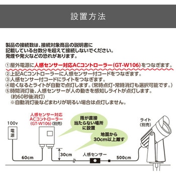 ガーデントワイライト専用 人感センサーです。時間消灯後、人感センサーが人の動きを感知しライトが点灯します。※自動消灯後などまわりが明るい場合は点灯しません人感センサー対応ACコントローラー(GT-W106)に使用可能※ACコントローラー(GT-AC36A)には使用できません。