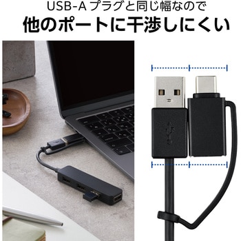 USB-Aプラグと同じ幅のスリムなUSB Type-C変換アダプターを採用しています。パソコンの隣り合うポートに複数同時に接続しても干渉しにくい設計です。
