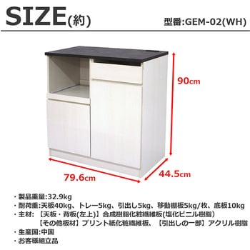 耐荷重(約):天板40kg、トレー5kg、引出し5kg、移動棚板5kg/枚、底板10kg