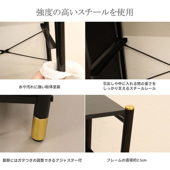 製品サイズ(約):幅88.5×奥行30×高さ76.6cm天板厚さ(約):1.2cm引出しの奥行(約):26.5cm製品重量(約):11.7kg耐荷重(約):天板/30kg、引出し/5kg主材:天板/メラミン樹脂化粧繊維板、フレーム/スチール引出し/前面:MDF板(PU革包み)、側面:紙板(不織布)、底部:MDF(不織布)表面加工:粉体塗装(エポキシ樹脂)お客様組立品