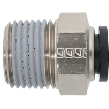 金属部には無電解ニッケルメッキを施しています。R(PT) ネジには、ネジサイズが一目で判別できる R(PT) ネジ別の色シールが塗布されています。チューブの取り出し方向に合わせてボディの位置決めができます。エルボ・テー等の R(PT) ネジ部と樹脂の結合部が回転し、継手取付後のチューブの取り出し方向に合わせて自由に位置決めができます。樹脂部を固定したままネジの締付けが可能です。チューブグリップが継手内でスムーズに回転し、チューブの回し切れを防止します。