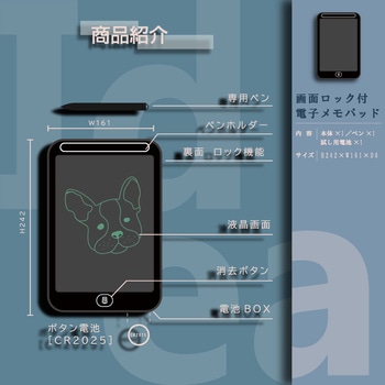 ●色:白色●★入数:1個●サイズ:161×242×6mm●重量:165g●画面サイズ:10インチ●画面ロック機能付き●電源:ボタン電池CR2025×1個(テスト品付属)●付属品:専用ペン×1本