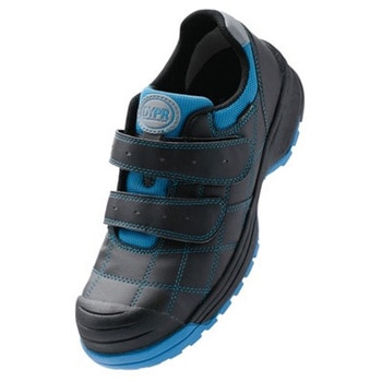 傷つき易いつま先を護るラバートゥーガード。かかと部は衝撃吸収材ポロン内臓。先芯はワイド樹脂先芯。アウトソールのかかと部は耐摩耗性の高いラバーを使用し、かかと部以外は耐滑区分「3」の滑りにくいラバーを使用。官公庁・駐車場管理・自動車整備・工業系学校・