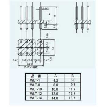 2.54mmピッチで3列連結したタイプのラッピング端子です。