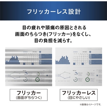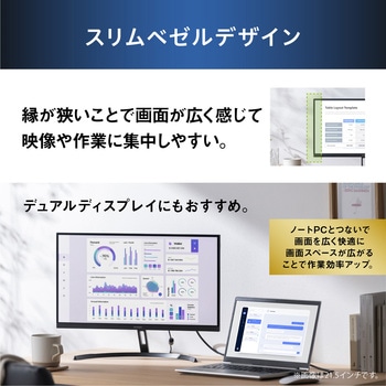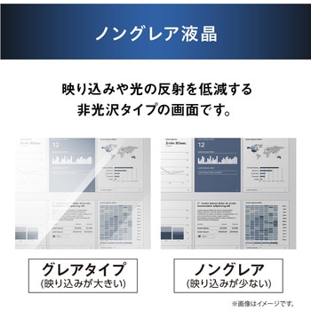 フレームが気になりにくい、スリムベゼルデザインです。映り込みや光の反射などがないノングレアタイプ(非光沢)で、目への負担が少ないため、長時間使用にもおすすめです。