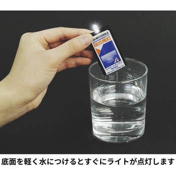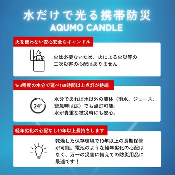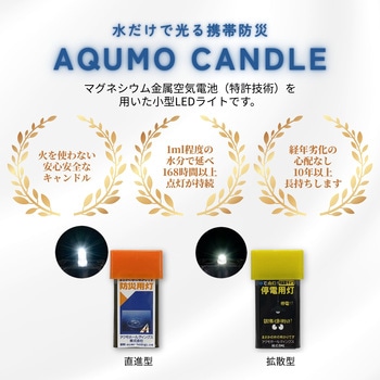 1ml程度の少量の水分に浸けるだけで、延べ168時間連続点灯する手のひらサイズの小型LEDライト。(国内外特許実用新案登録済)水分であれば水以外にも雨水、ジュース、緊急時は尿でも点灯可能。水が貴重な被災時にも安心。本体21gと小型軽量で簡単に携帯でき、いつでも防災対策可能です。直進タイプは灯りが直進的で、懐中電灯のように遠くを照らしたり、移動の際に足元を照らしたり、物を探す時にも便利です。