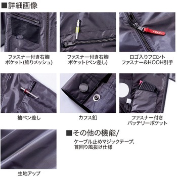 サイドファン仕様なので、ドライバーやリフト作業、座り作業の多い方にお勧めです。紫外線対策に効果的なポリエステル素材を使用し、過酷な環境での有害な紫外線からガードします。ケーブル止めマジックテープ付き首回り風抜け仕様