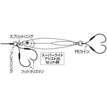 細軸・超貫通のスーパーライトアシスト対応アシストフックが登場!スーパーライトジギングに対応した超繊細アシストフック。フックは細軸ながら強度とフックポイントの耐摩耗性能が高いRYUGI製タリズマンを使用。防錆性能が高いシルバーメッキ仕上げは、ジグの周囲でキラメキによるアピール効果も期待できる。PE ラインはカラミにくい中芯入り。