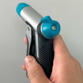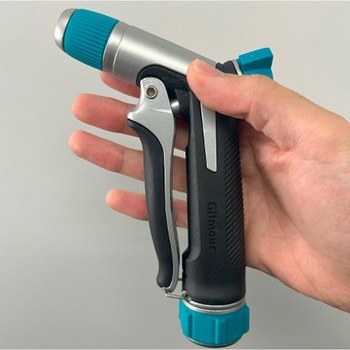 軽い力で握れるフロントトリガー。ヘッドを回すことでパターンを変更、後方のツマミで流量を調整可能。連続噴射クリップにより、握ることなく連続的にスプレー可能です。スイベル式カプラーにより回転する為、ホースのねじれを70%軽減。カプラー部分は握りやすい溝が設けられており、素早く簡単にホースを接続できます。グリップは滑りにくく、握りやすい人間工学に基づいた形状のハンドル。耐久性に優れた金属構造。
