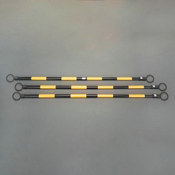 セット内容:伸縮ガードバー(3本)、収納バッグ。黄色の反射テープが巻かれています。夏、曲がりにくく、冬、割れにくい耐候仕様。ショルダーベルト、持ち手付。収納バッグ付。バッグの収納口は巾着のように絞れます。たためるスタンド付。1.5mのガードバーを収納すると0.4m程がバッグから出る状態で取り出しやすいです。かさ張るガードバーをまとめて収納して持ち運べる。ガードバー以外にも蛍光灯やモップ等、長尺物の収納にも使用できます。