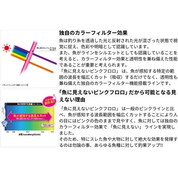 「魚に見えないピンクフロロ」 は一般のピンクラインと比べ、魚が感知する波長範囲を幅広くカットすることにより人の目にはピンクの色のままで見やすく、魚に対しては独自のカラーフィルター効果で 「魚に見えない」 ラインを実現しました。