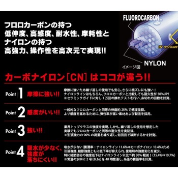 しなやかで操作性、耐ショック性に優れた超強力フカセ釣り専用パワーラインフロロカーボンとナイロンをブレンドした超強力複合素材 「カーボナイロン」採用ラインメンディングなどの操作性と遠投性能に優れたハリとコシを備え遠くのアタリもしっかり感知し、しなやかながらフッキングさせるフロロカーボンの低伸度性と高感度を兼ね備えたハイブリッドライン