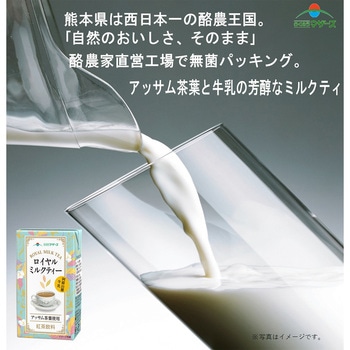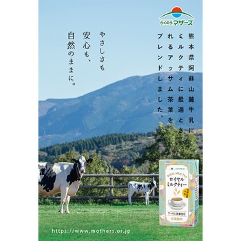 濃いめの紅茶とたっぷりのミルクがおいしいロイヤルミルクティーです。熊本県阿蘇山麓地域の牛乳を24%使用しました。紅茶はミルクティーに最適とされるアッサム茶葉を使用しました。まろやかな渋みと甘く芳醇な香りをお楽しみいただけます。英国王立化学協会推奨のMIF(ミルクインファースト)製法を採用しました。ホットでもアイスでもおいしくお飲みいただけます。熊本県は西日本1位(全国3位)の生乳の生産量を誇る酪農王国です。その中でも水がきれいで自然が豊かな阿蘇山麓地域に生乳の産地を指定し、酪農家直営工場で無菌パッキングしています。らくのうマザーズは、酪農家の生乳の生産を手助けし、牛乳や、牛乳をたっぷりつかった商品の製造、流通、販売までを一貫して行う総合酪農組織です。「自然のおいしさ、そのまま」をテーマに商品を製造しています。
