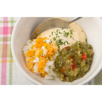 マヨネーズに混ぜるだけで手作りタルタルソースが簡単に作れます。スイートピクルスのみじん切りに、タマネギ、レッドピーマン、マスタードシード、セロリシード等をミックスしました。マヨネーズに混ぜるだけで手作りタルタルソースが簡単に作れます。鶏の唐揚げやフライにたっぷりと添えてお召し上がりください。その他、カレーの薬味やホットドッグのトッピングなど幅広くご利用ください。