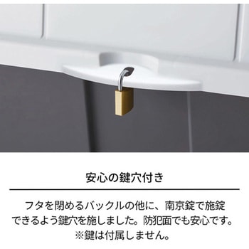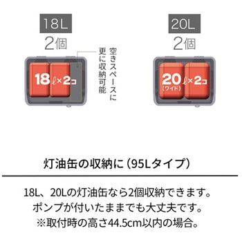 容量95Lのコンテナー(ストッカー)です。18Lの灯油缶なら2個収納できます。重い物でも取り出しやすい設計。市販の南京錠が付けられる鍵穴付きで、防犯面も安心です。南京錠取付可能(ツル径Φ9mmまで)。