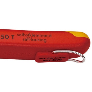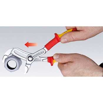 掴み面には特殊焼き入れされた歯がつけられています。材質はオイル焼き入れ焼き戻し処理済みのクロームバナジウム電気鋼。鍛造により大変頑丈です。DIN EN/IEC60900基準に適合。二種類の素材から成る1000V絶縁ハンドルは赤と黄のツートンカラーを採用することで、非絶縁ツールとの差別化を図っています。ワークに直接押し当てて設定、素早く、確実に、楽に操作できます。ワークに触れずに、ボタンプッシュで開きます。様々な大きさの工作物に最適に適合させるための精密調整と握りやすいハンドルポジション。ヘッドとジョイント部分のスリムな構造により、ワークへのアクセスにとくに優れています。パイプやナットにセルフロックするので、ワークから滑り落ちることがなく、力を入れずに作業できます。ボックスジョイント構造のダブルガイドにより非常に安定しています。挟み込み防止により、指が挟まれるのを防ぎます。滑り落ち防止を取り付けるための一体型絶縁固定留め輪付き。