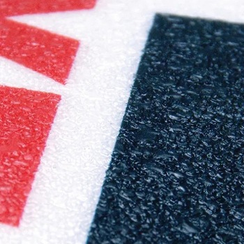 粘着。粘着式、取外し可能。片面印刷。厚い質感のビニールをラミネートしています。表面は滑り止めエンボス加工をしています。