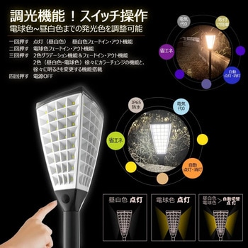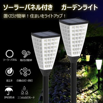 用途エントランス・玄関・お庭・花壇・家庭菜園などにセット内容ライト本体×2、杭×2、壁固定用ネジ×6、取扱説明書、保証書材質ABS質量(g)約450(本体)電圧(V)3.7消費電力(W)3全光束(Lm)最大320寸法(幅W×高さH×奥行D)(mm)100×690×100発光色昼白色(6300K-6800K)/電球色(3000K-3200K)バッテリー内蔵式リチウムイオンバッテリー 3.7V 1200mah使用環境温度(℃)-10~50防塵防水性能IP65(生活防水仕様)電池寿命充放電繰り返し回数:約500回充電時間(時間)約8(天候・設置環境により異なります)充電方式ソーラー充電RoHS指令(10物質対応)対応LED使用数(個)LEDチップ×128調光方式3モード:昼白色フェード・電球色フェード・交互フェード点灯(フェード⇒徐々暗く・明るくを繰り返します)照射範囲360°点灯方法スイッチ+光センサー(暗くなると自動点灯)演色指数(Ra)>85点灯時間(時間)約10-12内容量1セット