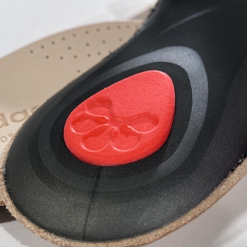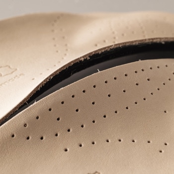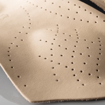 表面の牛ヌメ革が汗を吸収します。裏面の軽量で耐久性に優れたフットベッドがつま先を圧迫せず横アーチ、内・外側縦アーチを支え、ヒールパッドが歩行時のカカトの衝撃を和らげます。APMA(アメリカ足病学医師協会)認定製品。