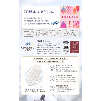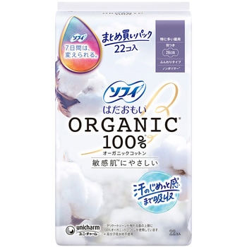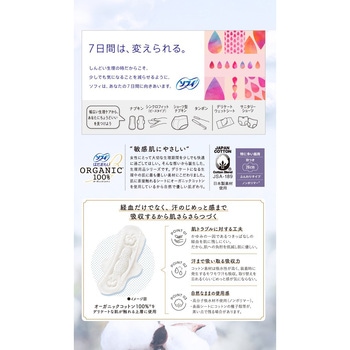 生理中の敏感肌にやさしい、はだおもいORGANICオーガニックコットン100%女性にとって大切な生理期間を少しでも快適に過ごしてほしい。そんな想いから誕生した、生理用品シリーズです。デリケートになる生理中の肌に最もやさしい素材にこだわりました。肌に直接触れるシートにオーガニックコットンを使用しているから自然でやさしい肌ざわり。●デリケートゾーンの肌が触れる面の上層に100%オーガニックコットンを使用。●かゆみの一因であるつきっぱなしの経血を肌に残しにくい。だから、肌への負担を低減し肌にやさしい。●コットン素材は吸水性が高く、装着時に発生するモワモワ汗も吸収。汗がこもらず、肌にやさしい。●高分子吸収材不使用(ノンポリマー)。<以下注釈>※表面シートにコットンの種子殻等が、黒い点で残る場合があります。医薬部外品