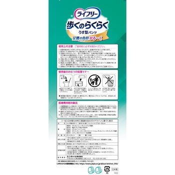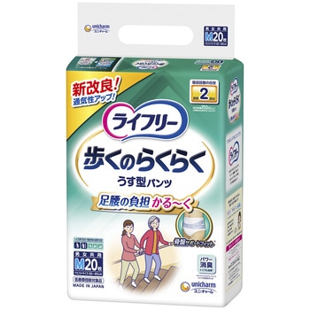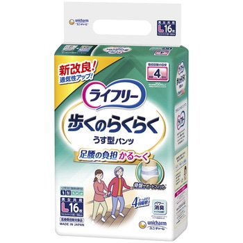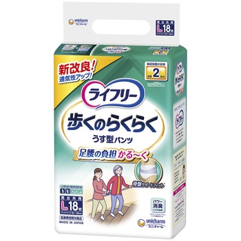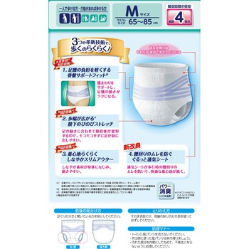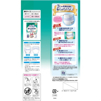 足腰の負担かる~く 歩くのらくらくうす型パンツ●世界初※1特許技術足腰の負担を軽くする骨盤サポートフィット®。腰まわりをサポートし、足腰の動きがラクになる。●新改良ぐるっと通気シート歩行時の腰回りのムレを防いで、快適な着心地が続く。●特許技術※2股下のびのびストレッチ。足の動きに合わせて吸収体が変形するので、足が前に出しやすい※5。●特許技術※3しなやかスリムアウター。しなやか素材が身体になじみ、モコモコせずに動きやすい。●Ag+配合、パワー消臭トリプル効果※4。●たっぷり4回吸収。<以下注釈>※1主要グローバルブランドにおける大人用紙おむつ対象 2019年3月ユニ・チャーム調べ。前側は股下側に凸に湾曲させ、後側はウエスト端部側に凸に湾曲させた胴回り伸縮フィルム配置構造。※2吸収体に斜め方向に配置された低繊維量部があり、低繊維量部が伸縮領域と重なる吸収体構造。※3非伸縮不織布に挟まれた伸縮不織布を間欠に超音波接合した、ウエスト構造。※4アンモニア・ジメチルアミン・インドールについての消臭効果があります。ウエストサイズMサイズ(65~85cm)Lサイズ(80~100cm)医療費控除対象品
