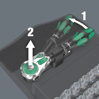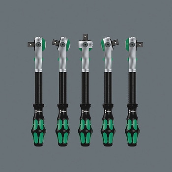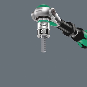 使用頻度の高いソケットとエクステンションバー2本(76/200mm)がセットになっています。ホールディングファンクション(HF)により、ボルトやナットを着磁機能なしで保持できます。軸部の空回り機能により早回しがスムーズに行えます。首振り式で角度調整が0°、15°、90°で固定できます。ギア数72枚(送り角5°)で狭いスペースでの作業が可能です。頑丈なテキスタイルケース入りで持ち運び・保管に重宝します。