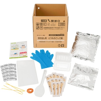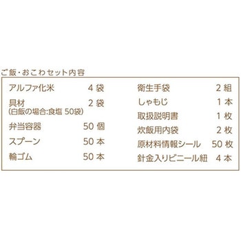 | 80294840 | 11408632 | 弁当容器50個、しゃもじ1本、輪ゴム50本、スプーン50本、衛生手袋2組、炊飯用内袋2枚、針金入りビニール紐4本、原材料情報シール50枚、取扱説明書1枚 | アルファ化米4袋、具材2袋(白飯の場合:食塩50袋) | 白飯 | 白飯 | | ¥12,000 | ¥11,980 | ¥12,938(税込) |