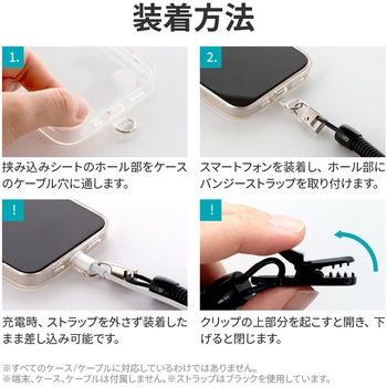 スマホの落下を防ぐバンジーストラップ/胸ポケットへの装着に最適なクリップタイプ/最長60cmで胸ポケットから落としても地面につかない/付属の挟み込みシートで、ケースにストラップホールが無くても装着可能/スマホ以外にも使えるストラップパーツ付属