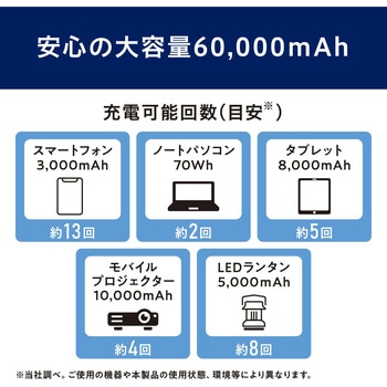 コンパクトなサイズながら、60000mAhの大容量でスマホやPC、カメラの充電は複数回可能。電気毛布やサーキュレーター等の連続使用にも。
