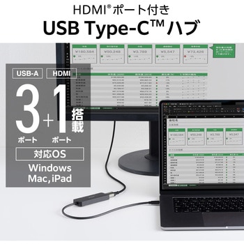 USBハブにHDMI(R)ポートをプラス。USB Type-C(TM)コネクター接続で安定動作を実現!USB 5Gbps(USB3.1(Gen1))対応のUSBマルチハブです。USB-Aポート3つとHDMIポート1つを搭載、周辺機器の使用や映像出力ができます。機能を絞った薄型設計で、持ち運びにも便利です。