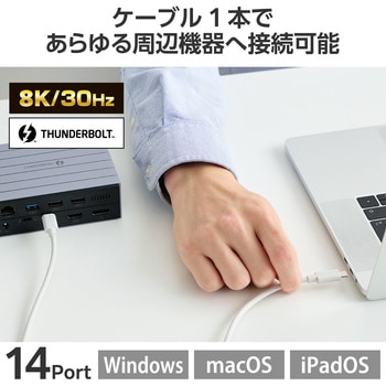 Intel(R) Thunderbolt 4を含む14ポート搭載。据え置き型でパソコンの機能を大幅に拡張できるドッキングステーションです。Thunderbolt 4ケーブルが付属し、最大40Gbpsの転送速度を提供しながら、映像を最大8K/30Hzまで出力可能。最大60W給電でノートパソコンへの充電もでき、あらゆる周辺機器への接続をケーブル1本で行えます。