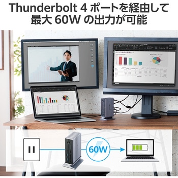 Thunderbolt 4ポート(アップストリーム)を経由して最大60Wの出力が可能。ノートパソコンへの充電が可能です。