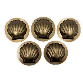 ホタテ型の単品5個セットです。天板とは違い、単品バラ売りのため好きな数を自分で決めて焼くことが出来ます。熱伝導も良く焼き色も均一に仕上がり、また空焼き不要のため軽く水洗いをするだけですぐにお使い頂けます。すべて日本製の材料を使用し、丁寧な商品の作り上げは自社ならではの逸品です。シルバーと比べシリコンを厚塗りしている為、シリコン加工の耐久性が良くなっております。シルバーよりも厚くシリコン加工が施されているため型離れが非常に良く、丈夫で滑らかな手触り。材料は0.6mmの鉄板を使用。