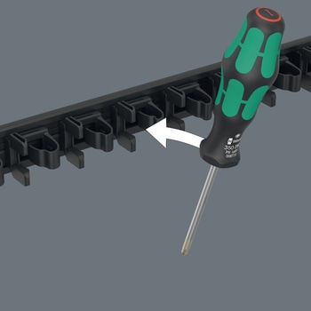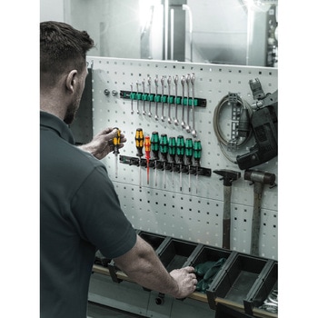 レールをボルトで壁に固定することが可能です。クラフトフォームハンドルは人間工学に基づいた快適なドライバーで、マメやタコを防ぎます。ハードハンドルゾーンは早回しを可能にします。ソフトハンドルゾーンはしっかりと力を伝えます。932 Aは貫通軸六角ブレードとインパクトキャップ付き、350、355、335はレーザーチップ付き:Wera(ヴェラ)レーザーチップドライバーの先端は、レーザー光線で微細に粗面化されています。ネジの頭に「食い込み」カムアウトを防ぎます。160 iS 電気工事用VDE、レーザーチップ付きです。"Take it easy " 色分けシステム:刃先とサイズによって色分けされ、必要なツールをすばやく簡単に識別できます。クラフトフォームドライバー6本、端子ストリップ付きの汎用ドライバーセットです。プラスドライバー、ポジドライブ(レーザーチップ付き)、トルクスねじ用です。ブレード径が先細りになっている電気工事用VDEマイナスドライバー1本入りです。マイナスドライバー2本:ネジ回し、ノミ切り、ほぞ切り用です。マグネットで金属面にしっかり固定できる端子ストリップレール入りです。