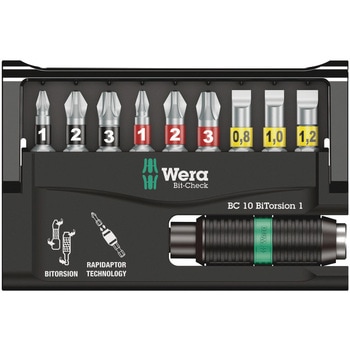 Weraによる堅牢なビットチェック。使用可能なツールの概要を迅速に把握することができます。不要なビットはセットに入れ直すだけで、紛失することはありません。シャツのポケットなどに入れて簡単に持ち運ぶことができます。汎用性の高いタフな粘性ビットを採用。トーションゾーンを備えたBiTorsionビットは、ピーク負荷時に運動エネルギーを分散してくれ、製品寿命が大幅に延長され、対応のホルダーで最高の耐久性を実現します。スリーブを作動させることなくビットを装着できるRapidaptorテクノロジーを搭載。ビットの取り外しは、スリーブを前に押し出すだけなので、片手で簡単にビットの交換が可能です。DIN ISO 1173-C 6.3およびE 6.3準拠の1/4インチ六角ヘッドドライブ付きビットの取り付けに、電動ドライバーや電動ドリルのチャックに挿入して使用することができます。直立保管可能、マルチコンポーネントビットチェックセット。ラピダプターホルダー、スムーズ二ビットの交換ができます。バイトーションビット、耐久年数が長い。”Take it easy”色分けシステム:形状によって色分けされています。