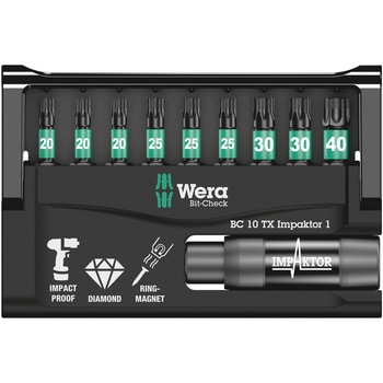 ヴェラ ビットチェックセット。ビットチェックにより、必要なツールを視認できます。使わないビットは専用のケースにセットしておけば、安全に保管できます。シャツのポケットに入れられるサイズですので、携行に便利です。インパクターテクノロジーにより、厳しい条件下でも標準以上の耐久年数を実現します。ビット先端にはダイヤモンド粒子がコーティングされており、リセス(ネジの窪み)にしっかり食いつき、必要な負荷圧力を減らし、カムアウトを防止します。付属のインパクターホルダーは、ダブルトーションスプリングにより極端な加力負荷を緩和できます。リング磁石付きで、長くて重いネジもしっかり固定し、頭上作業に最適です。磁石部を押し込むことで取り外しできます。 従来のインパクトドライバーでの使用に適しています。直立保管可能、マルチコンポーネントビットチェックセット。インパクターテクノロジーにより、耐久年数が平均より長いです。インパクトドライバーに最適。ダイヤモンドコーティングにより、ネジ頭に食いつき、カムアウトを防止します。環状の磁石付きホルダー、長くて重いネジを保持できる。