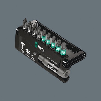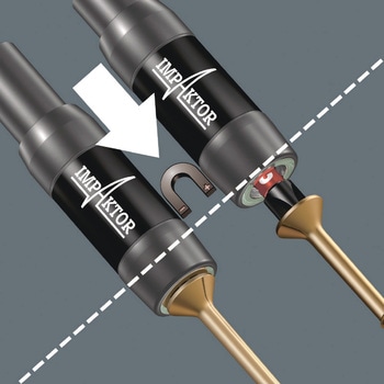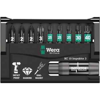 Wera による堅牢なビットチェック。Bit-Check は、利用可能なツールの概要を提供します。不要なビットはセットに再挿入するだけで、紛失することはありません。シャツのポケットなどに入れて簡単に持ち運べます。Impaktor テクノロジーは、極端な状況下でも平均以上の耐用年数を提供します。ビット先端の粗いダイヤモンド粒子コーティングにより耐摩擦性が向上し、ネジ頭からの抜け落ちを防ぎます。極端な衝撃ピークを吸収するための衝撃ホルダー。ダブルトーションスプリングによる特殊なトーション効果。リングマグネット付なので長くて重いネジもしっかりと保持し、頭上作業に最適です。磁石を押し戻すことで中和することができます。特に通常のインパクトドライバーとの使用に適しています。
