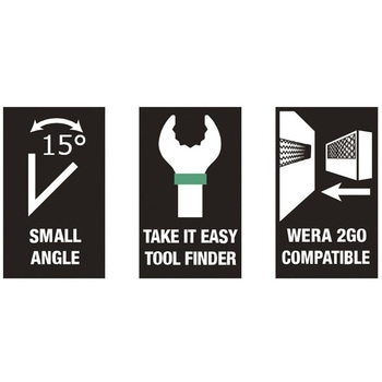狭いスペースに最適。特殊な形状により、ツールとの接触面を増やします。スパナ部の小さな回転角度により、15度以内に対応できます。傾斜角度は15度のスリムなレンチヘッド。Wera2goシリーズ製品と組み合わせて使用できます。