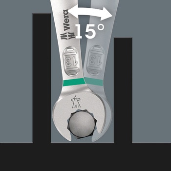 7.5° 回転する口と二重六角形の形状の組み合わせにより、配置ポイントが 2 倍になります。ねじ締め中に長手方向軸の周りでレンチを 180 度回転させると、4 通りの配置が可能になり、ボルトまたはねじの頭を 15 度ごとに「取り出す」ことができます。スマートな口の形状を備えており、限られたスペースでの使用範囲を大幅に拡大します。ターンごとにそれぞれの配置ポイントを自動的に見つけます。スリムでありながら堅牢なリング側面は工具軸に対して 15° の角度が付いています。高品質の表面処理により、高い防食効果と長期の持続性を実現します。Take it easyツールファインダーを使用すると、サイズごとに色分けされます。ジョーカーポーチは、背面の面ファスナーシステムにより、壁、棚、ワークショップ用トロリー、Wera 2go システムへの取り付けに適しています。