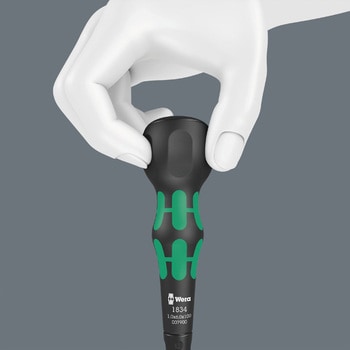 マイナスネジ用のKraftformシリーズ 1800 ハンドルを備えたドライバーです。ハンドルが手にピッタリと収まります。凸型形状により、高いトルクの伝達が可能です。ソフトハンドルゾーンは、快適なグリップ感とロスの少ないパワー伝達が得られます。硬いハンドルゾーンは、手のひらで圧力をかけている時でも、高いパワー伝達を可能にします。ハンドル上端の凹みが、ネジ回し使用時の微調整を容易にします。ハンドルとブレードの境目が狭いため、狭い場所にあるネジにも容易に手が届きます。ハンドル後端には転がり防止保護がついており、作業場でツールが転がって迷惑になることがありません。Wera(ヴェラ)レーザーチップドライバーは、レーザー光線により、微視的に粗面化されています。粗面化された表面がネジ頭に「食い込む」ので、予期せず外れることがありません。