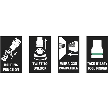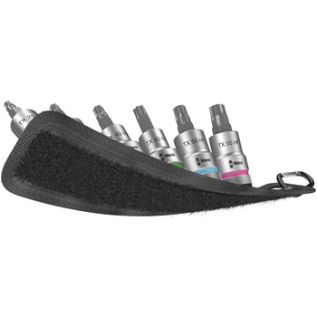 丈夫なテキスタイルベルトにセットされた6ピースソケット。スムーズにひねってロックを解除するメカニズムにより、しっかりとフィットし、ソケットを簡単に取り外すことができます。ベルト ループやバッグに取り付けるためのスナップ フックが付いています。保持機能付きソケットは、ワークに近づくときにねじを紛失するリスクを軽減し、特にねじ締めに便利です。壁、棚、工具トロリー、Wera 2go工具搬送システムなどに簡単に取り付けるための不織布裏面と面ファスナーストリップが付属しています。