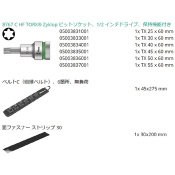 セット内容ソケット 003831・003833・003834・003835・003836・003837(TX25・30・40・45・50・55)、ベルトC 45×275mm、面ファスナー ストリップ 30×200mm収納数ソケット6個ベルト寸法(mm)45×275差込角(sq.)1/2内容量1セット